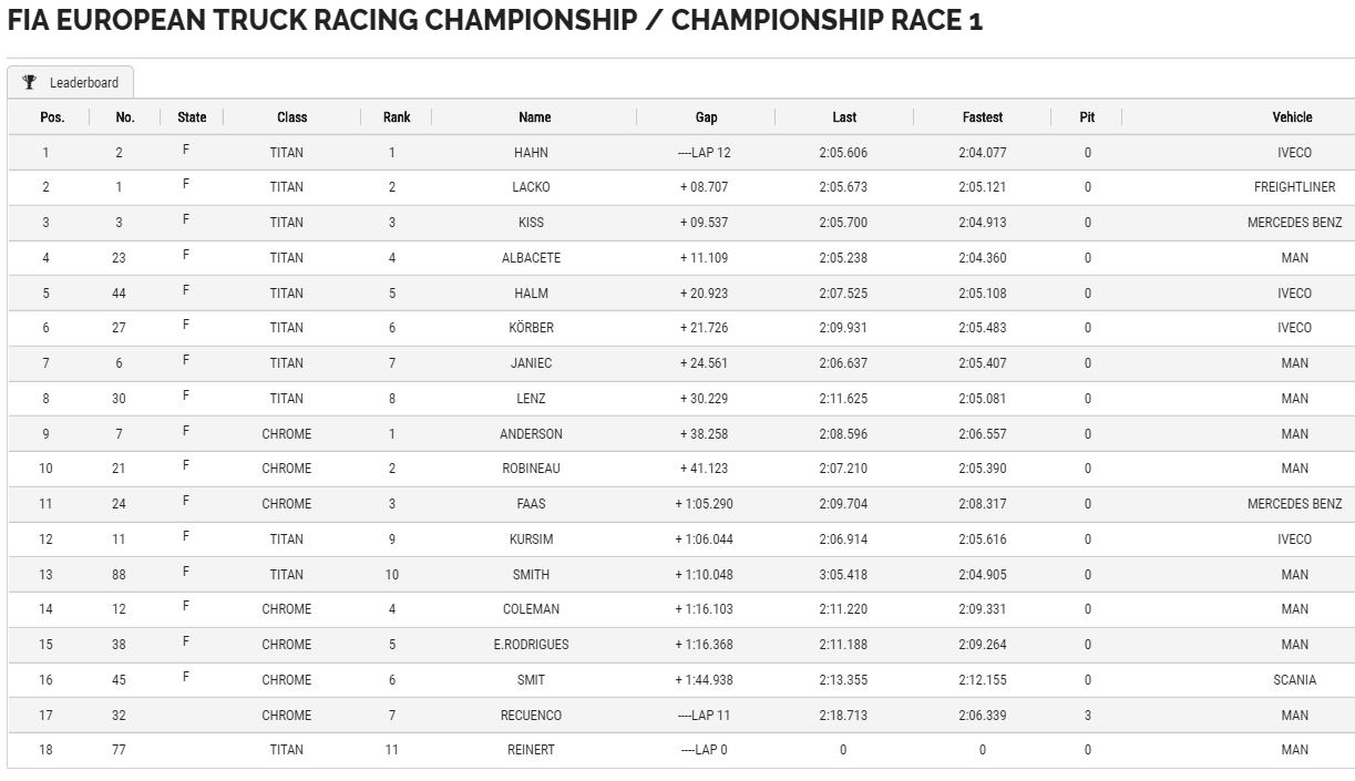 *post-race #3 Team Tankpool24 Racing Mercedes-Benz truck of Norbert Kiss was found underweight resulting in the entry being excluded from the results.